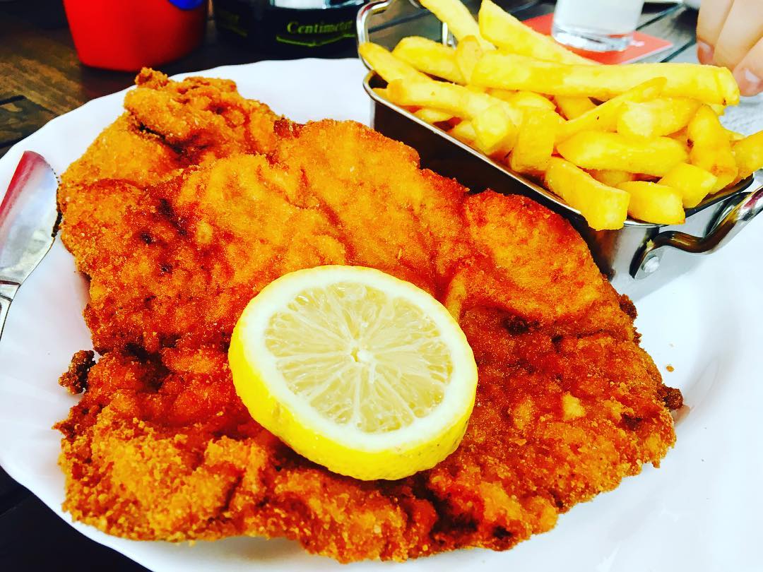 Una fettina di carne di vitello battuta fino a farla diventare sottilissima, ricoperta di farina, imbevuta di uovo sbattuto, rigirata nel pan grattato e infine fritta. Niente a che invidiare a una cotoletta, ma mangiata a Berlino, con un po’ di limone e patatine fritte, forse ha tutto un altro sapore.