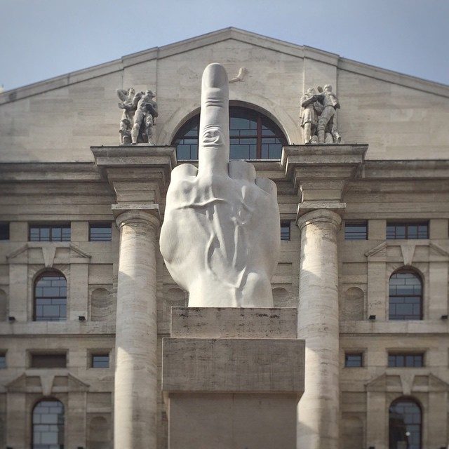 Vai a Piazza Affari, sede della Borsa di Milano a cogliere l’ironia dell’irriverente scultura di Cattelan. Si trova posizionata proprio di fronte all’edificio quotidianamente popolato da banchieri, questo ha creato molte congetture sul significato dell’opera, che però non sono mai state chiarite dall’autore.