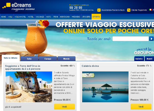Grazie al potere dell’acquisto collettivo, Groupon amplia ulteriormente l’offerta eDreams proponendo pacchetti viaggio in Italia e all’estero, validi per 24 ore e caratterizzati da prezzi straordinari.