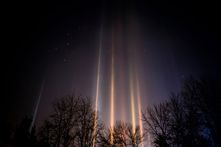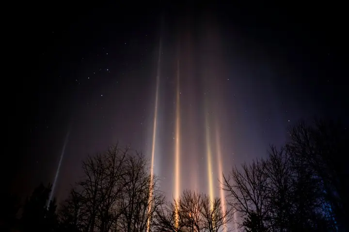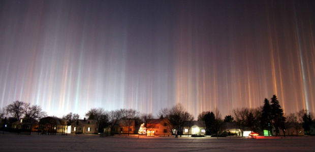 Le colonne di luce sono un fenomeno ottico causato dal riflesso della luce del sole o della luna sui cristalli di ghiaccio presenti nell’atmosfera. Possono anche essere provocate dall’emissione di luce da parte di fonti terrestri artificiali, come i lampioni. Le colonne sono più visibili durante il tramonto, quando il sole si trova sotto la linea dell’orizzonte.