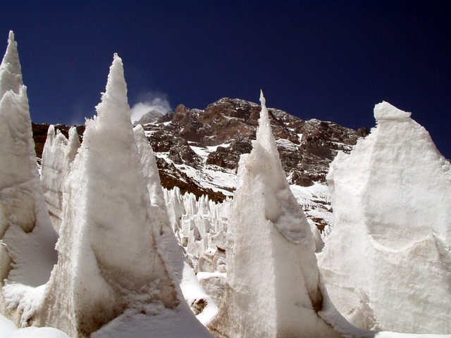 Il fenomeno dei “penitentes”, guglie di ghiaccio che possono raggiungere l’altezza di una persona, è stato osservato per la prima volta nel 1839 da Charles Darwin durante un viaggio da Santiago verso la città argentina di Mendoza. Non si sa esattamente come si formino, ma l’ipotesi principale è che siano modellati dai forti venti che soffiano dalle Ande; si possono ammirare solo tra il Cile e l’Argentina.