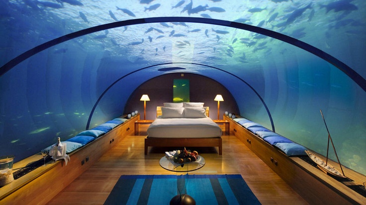 Rangali Island in the Maldives. Conrad Maldives Hotel has this awesome underwater suite and an undersea restaurant.