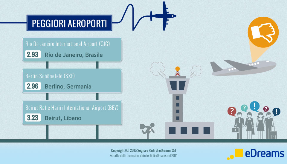 Come ogni anno, anche durante il 2014 i clienti eDreams hanno espresso la loro opinione sugli aeroporti di tutto il mondo e grazie alle loro valutazioni abbiamo potuto stilare la classifica dei migliori aeroporti del 2014: trovate la lista generale dei vincitori e i primi classificati nelle categorie di shopping, bar e ristoranti e sale d’attesa a questa pagina.