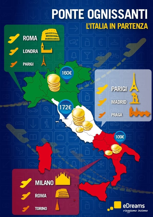 Infografia dei viaggi effettuati dagli italiani per il Ponte del 1º NovembreInnanzitutto risulta essere degno di nota il fatto che il 41% dei viaggi prenotati attraverso eDreams vengono effettuati all’interno dei nostri confini nazionali, con Roma, Milano e Napoli come destinazioni favorite. Ma sono tanti anche gli italiani che vanno alla scoperta dell’Europa e delle sue capitali. Così come per il ponte del 2 giugno, anche per questa breve vacanza autunnale spiccano mete come Londra, Parigi e Madrid tra le preferite.