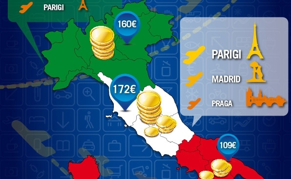 Dividendo, poi, l’Italia in tre zone, vediamo che dal Nord si registra il maggior numero di partenze (61%) e le destinazioni favorite sono Londra, Roma e Parigi, con una spesa media di 160 € per un biglietto di andata e ritorno.