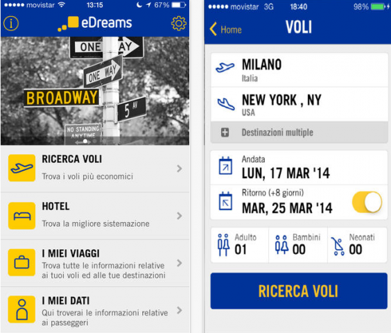 * sconto di €10 per ogni prenotazione di voli, valido solo per prenotazioni portate a termine sulla app per iPhone. La riduzione è calcolata in relazione ai prezzi mostrati su www.edreams.it. Tutti i prezzi visibili sulla app includono automaticamente lo sconto.
