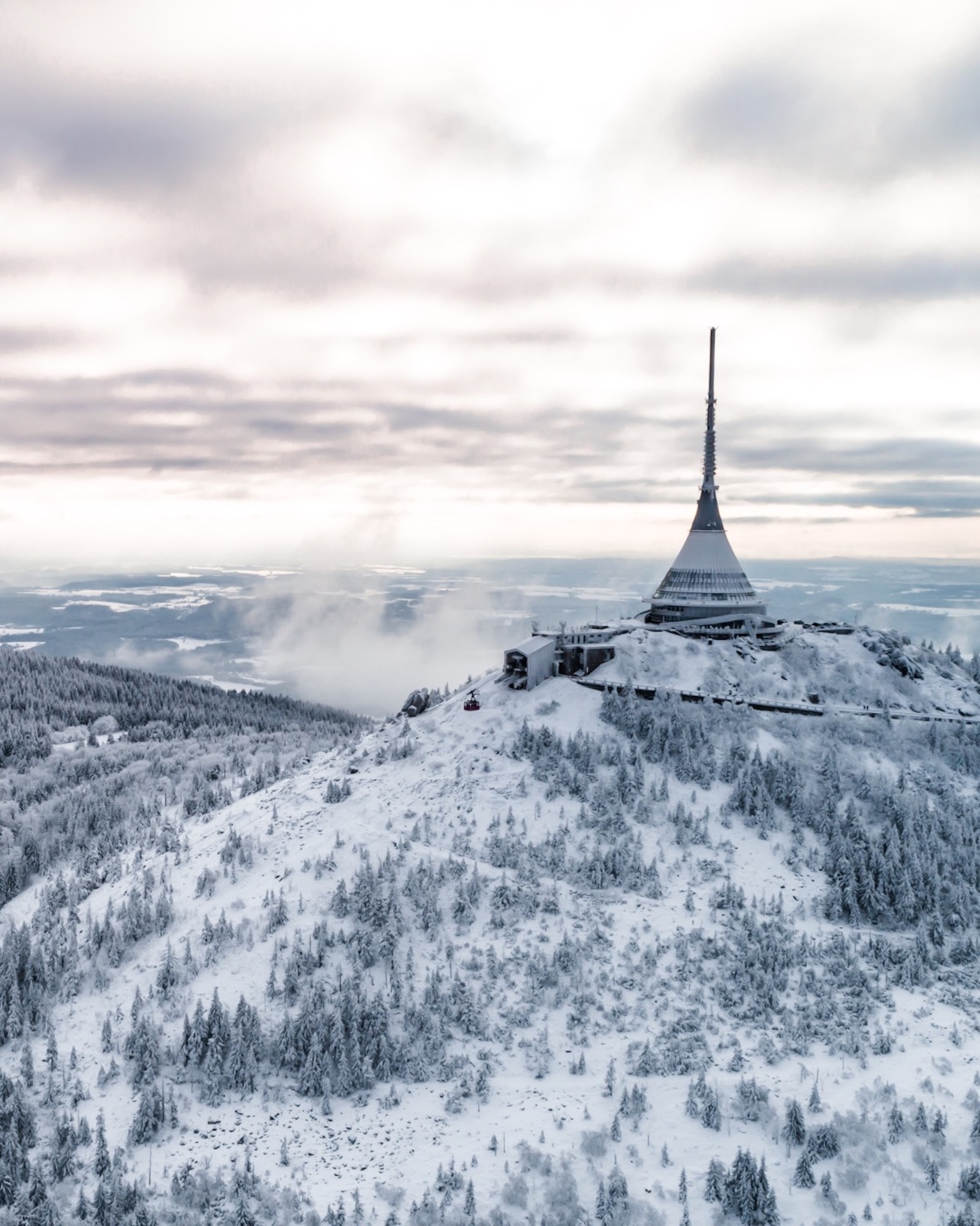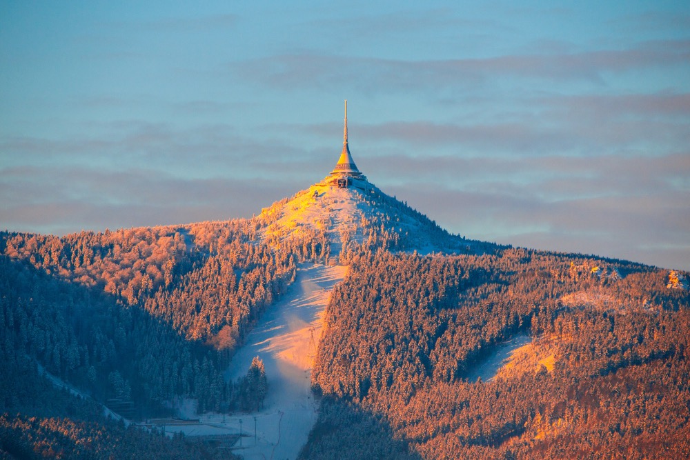 Da qui, una breve corsa ti porta al Monte Ještěd, sormontato dalla futuristica Torre Ještěd. Prendi una breve passeggiata e ammira un panorama che sembra uscito da una sfera di neve.